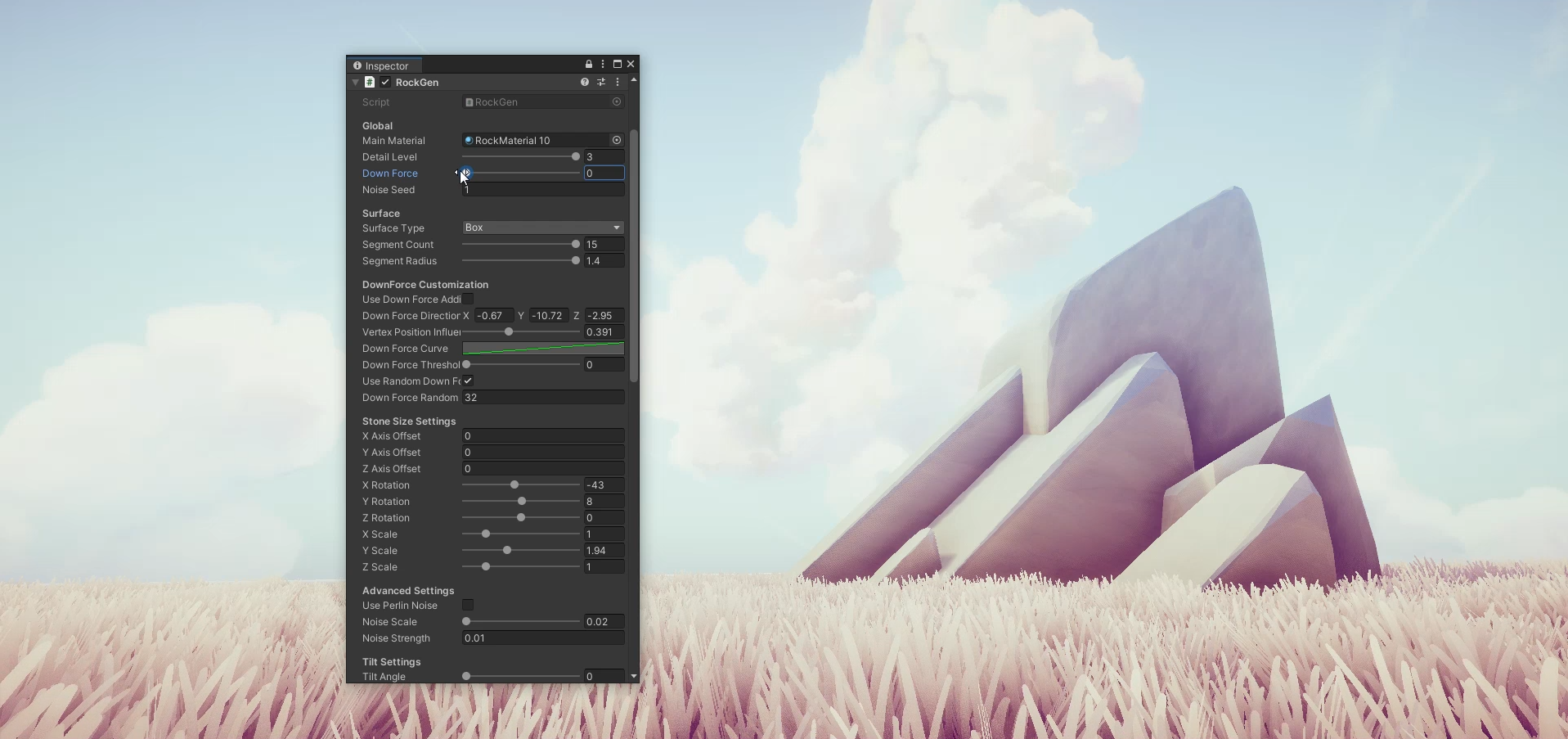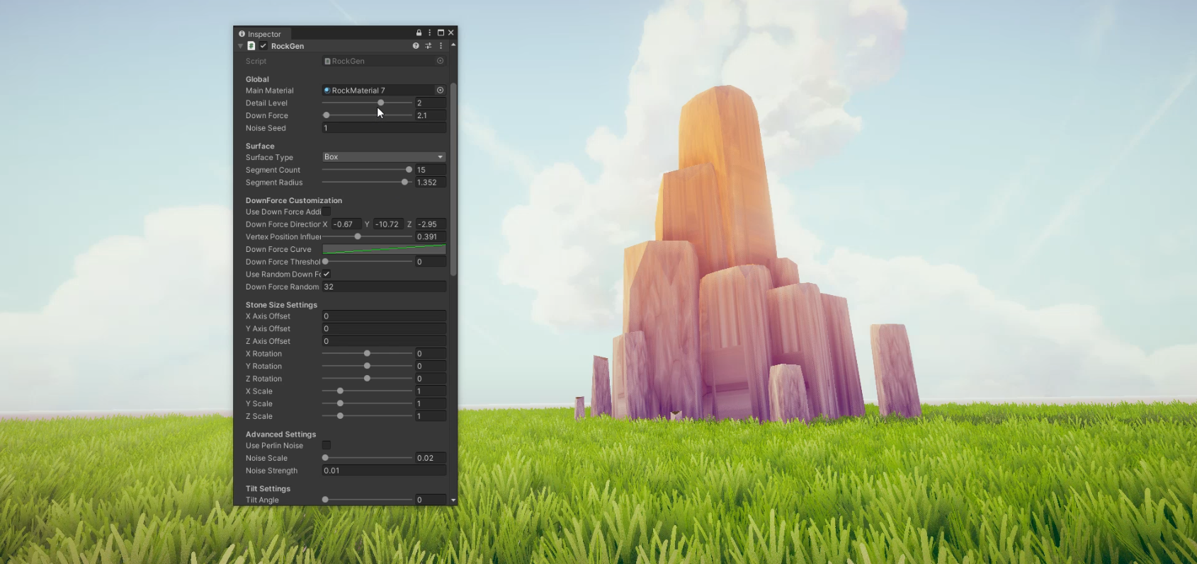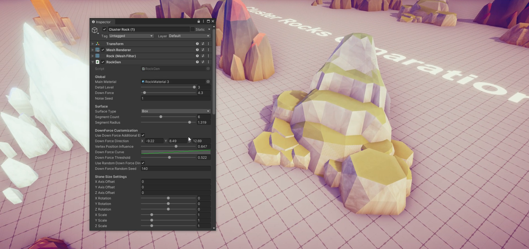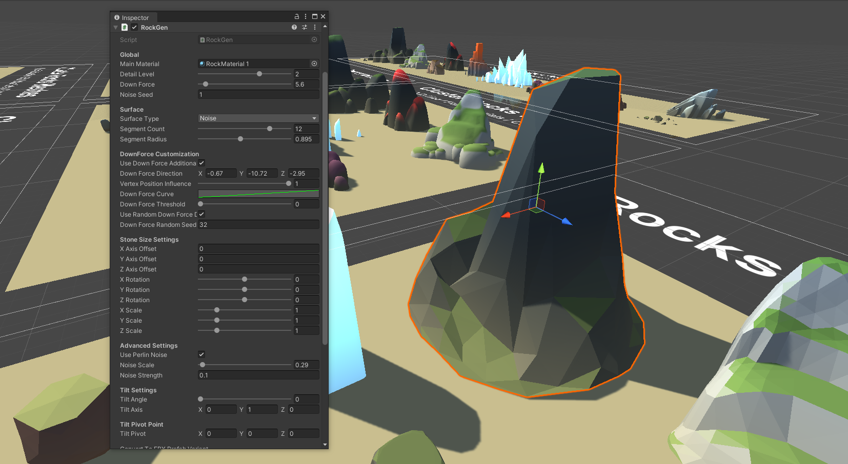 Full control over rock generation through intuitive parameters. Adjust size, shape complexity, surface detail, scale, and countless other properties to create exactly the rocks you need for your project.