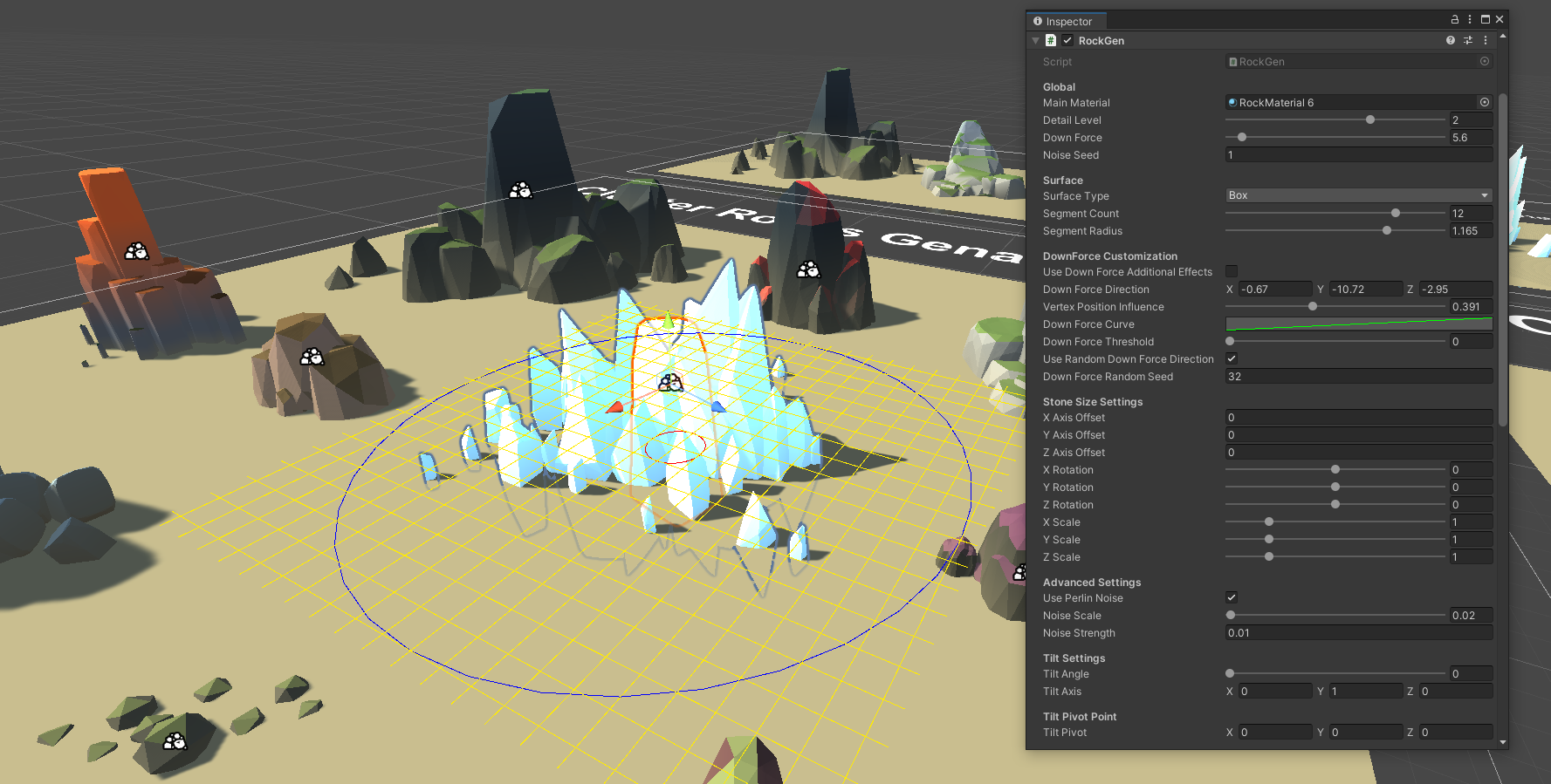 RockGen 2024 is a procedural rock generator for Unity that eliminates the tedious process of collecting or creating rock assets manually. It generates unique, high-quality rock meshes directly in the editor using advanced procedural algorithms, providing infinite variation without relying on pre-made models.