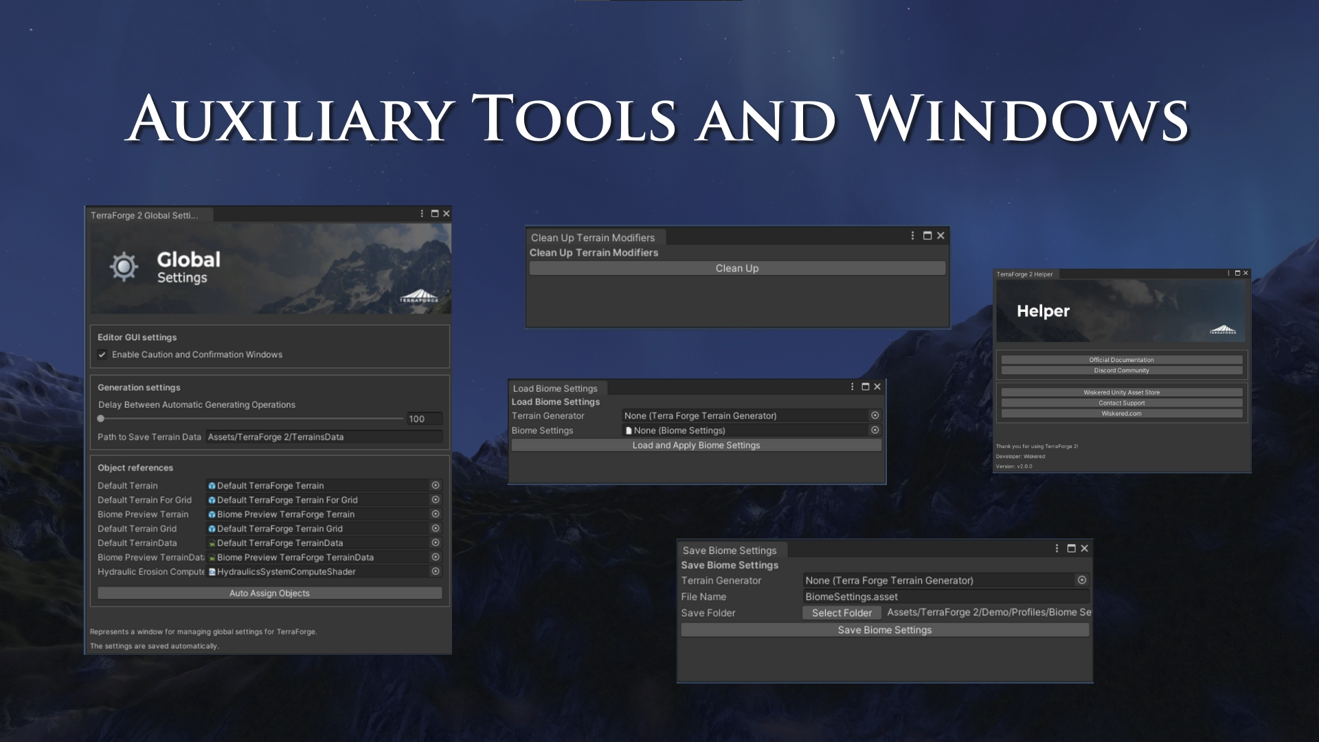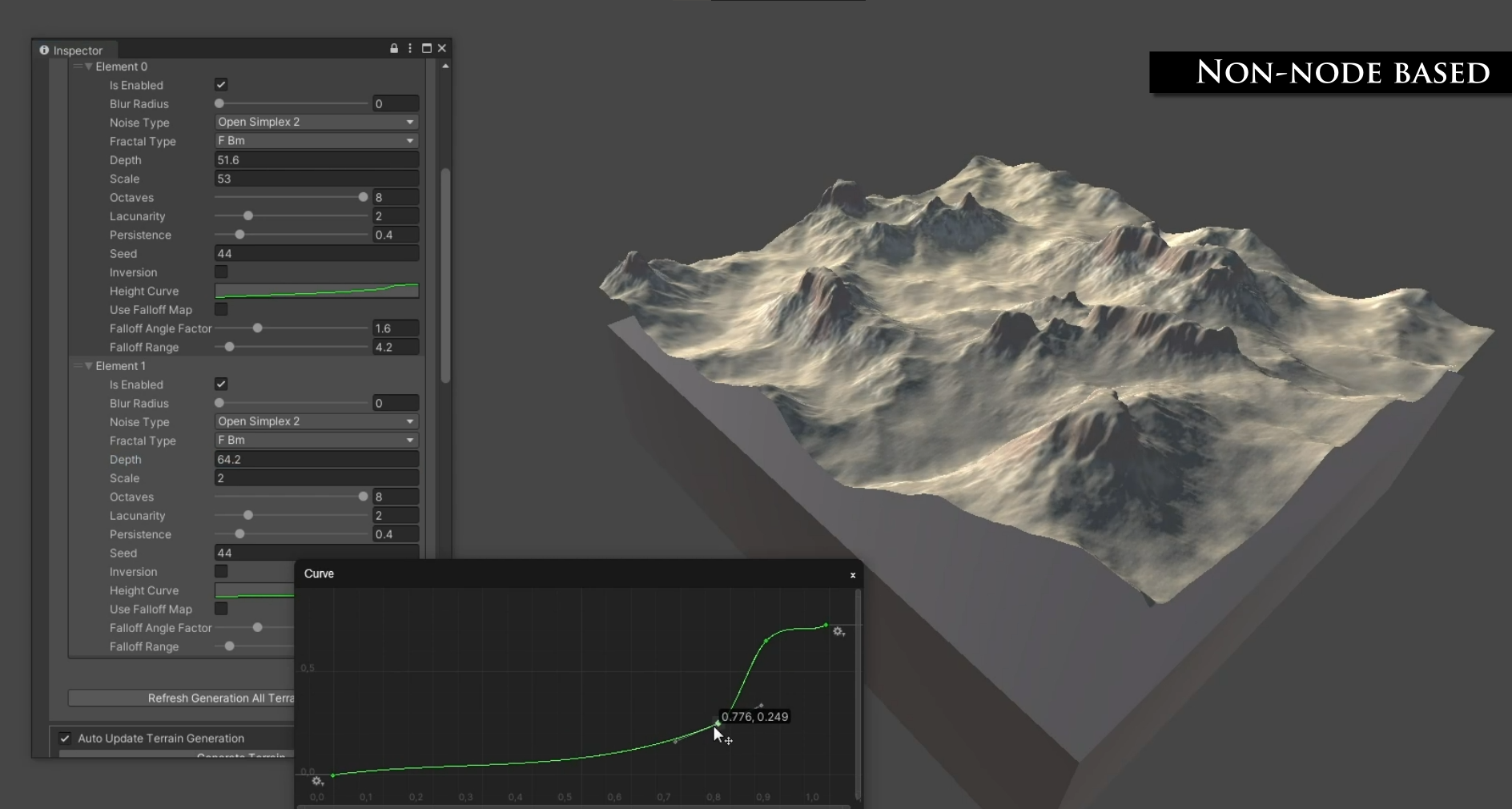 TerraForge 2 prioritizes simplicity over complexity. Unlike node-based terrain systems that overwhelm with endless options, it provides a non-node interface focused on essential controls that produce professional results. The emphasis is on intuitive parameter adjustment and direct visual feedback.